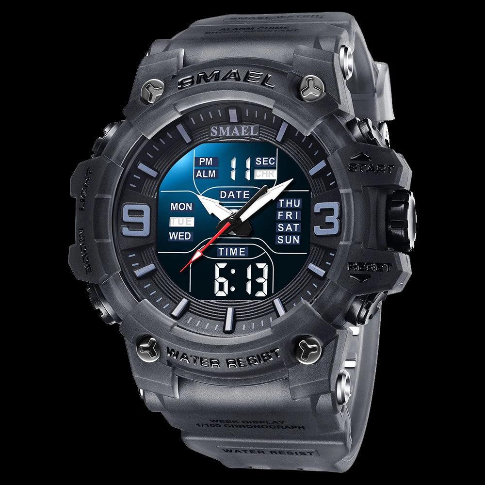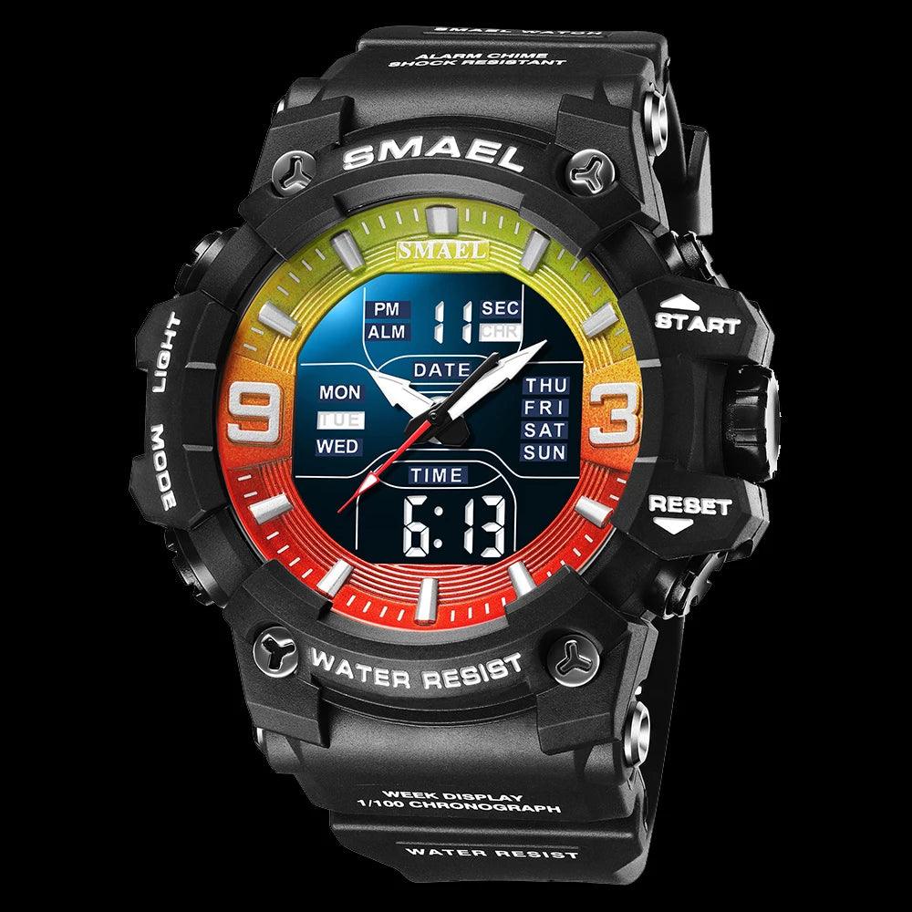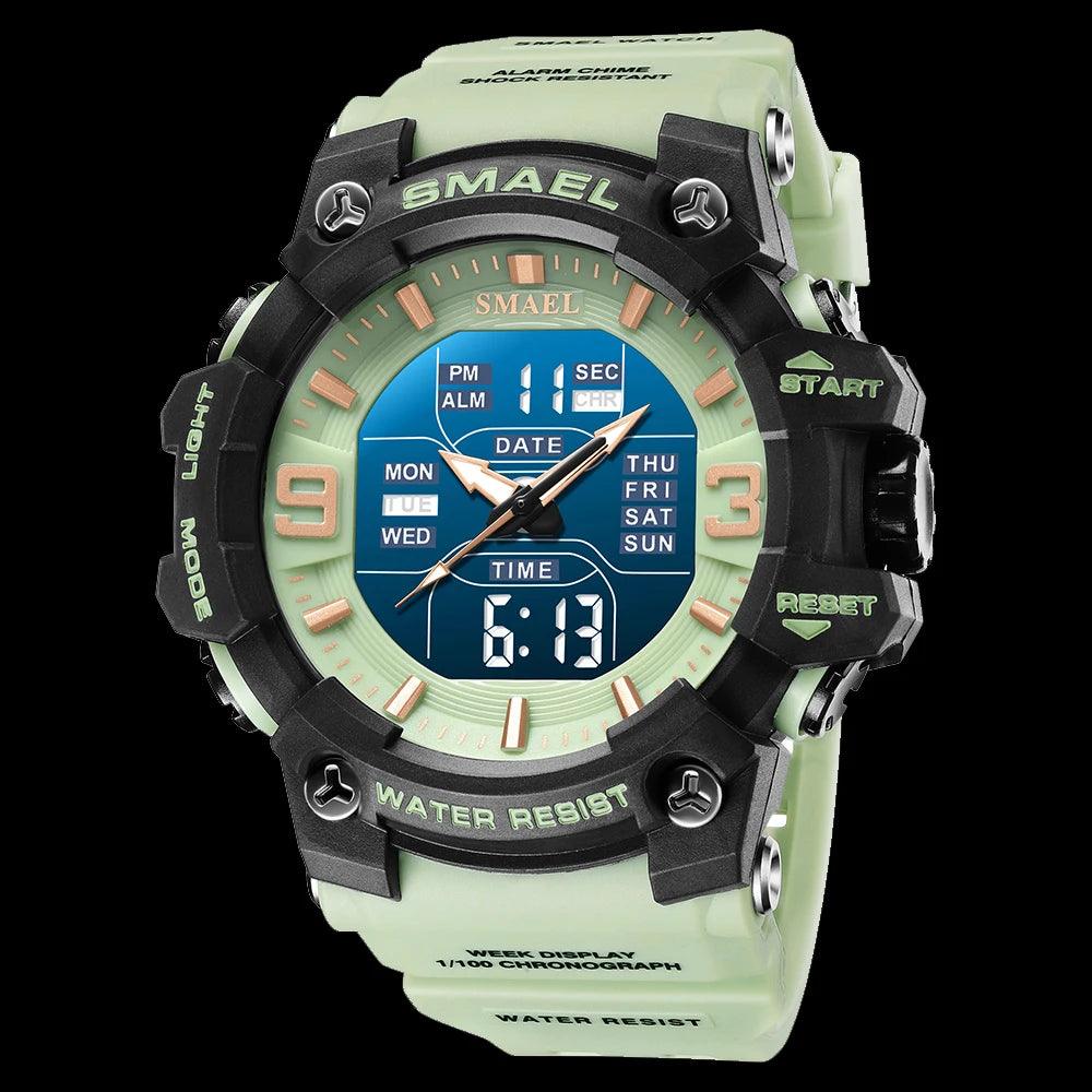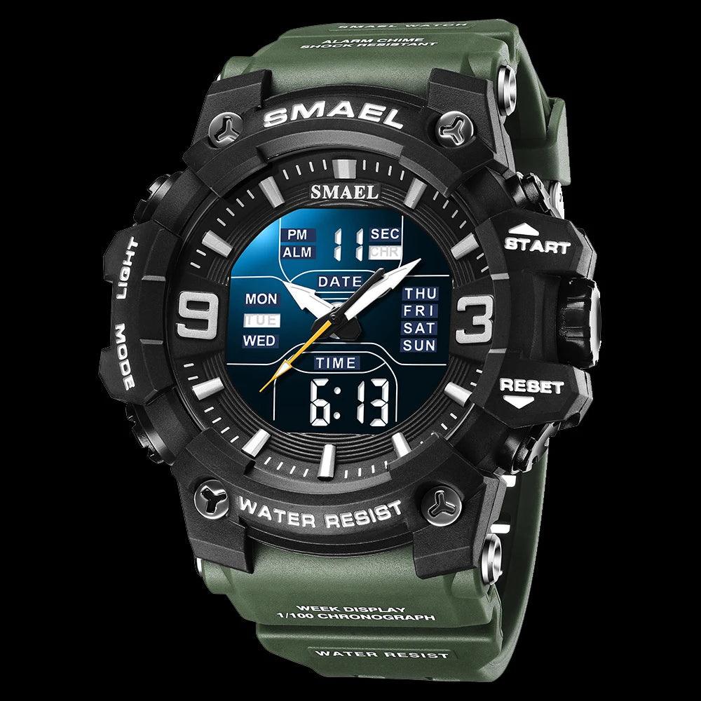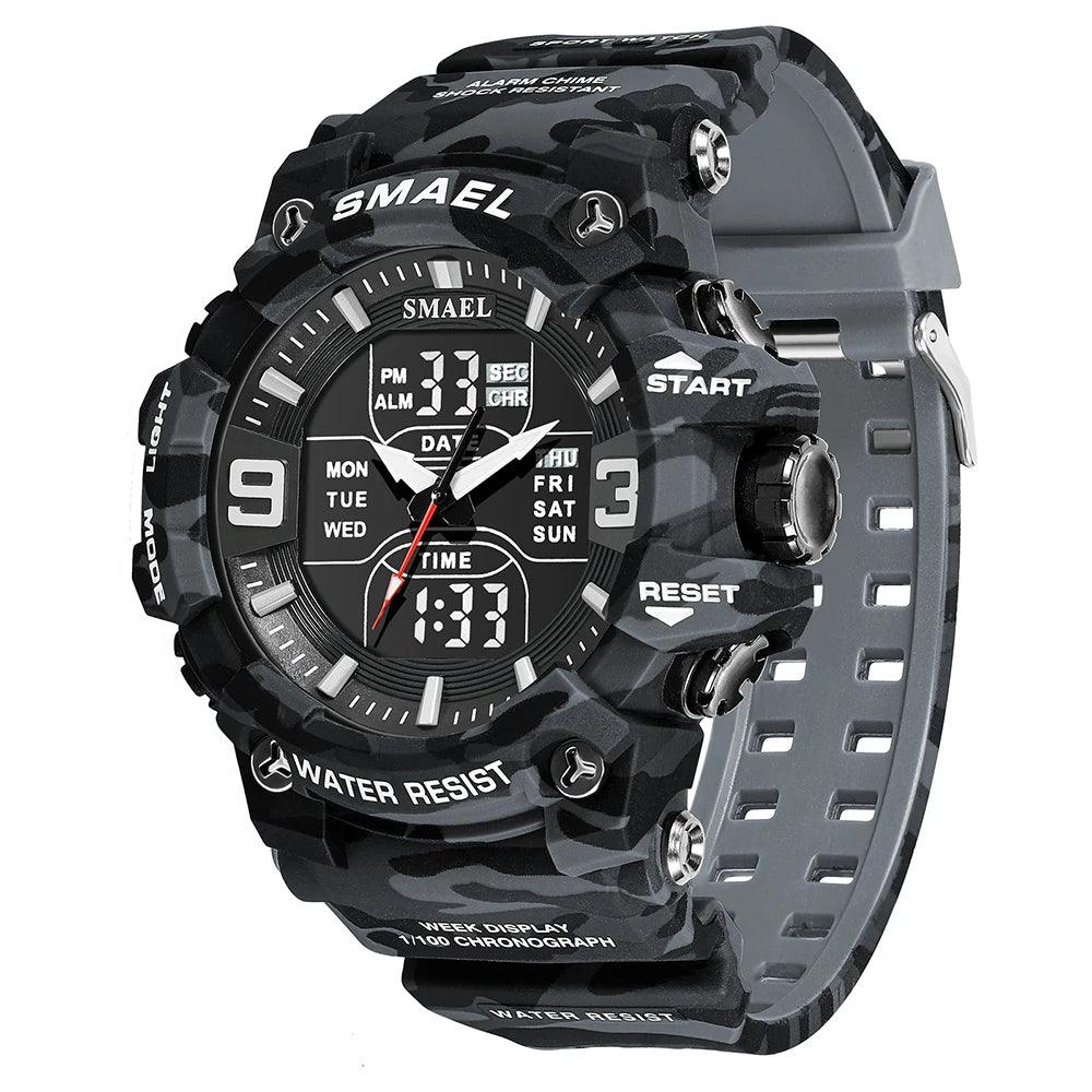 Este relógio Smael masculino é perfeito para atividades ao ar livre. Com design militar camuflagem e resistente à água, este relógio possui movimento de quartzo analógico e digital, com função de tempo duplo para maior praticidade. Ideal para um estilo casual e esportivo.