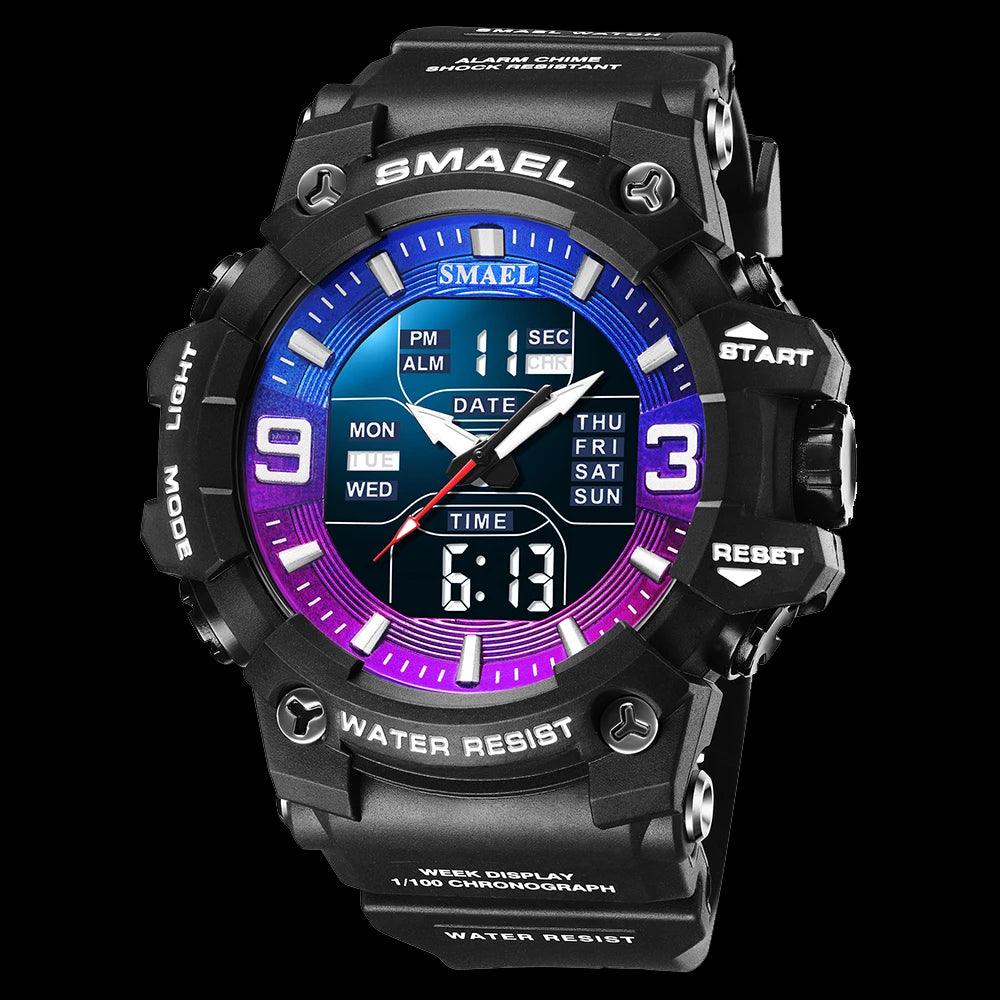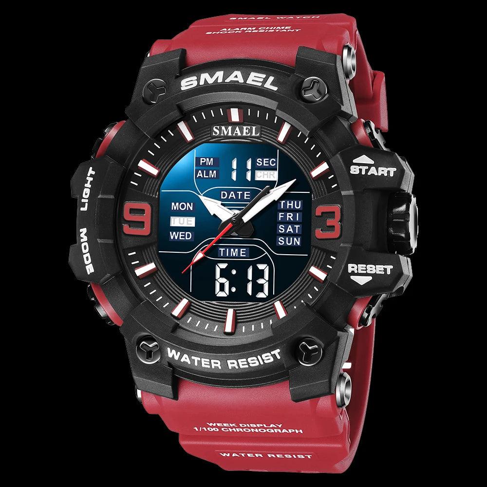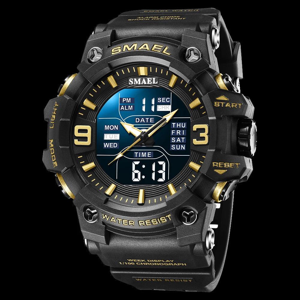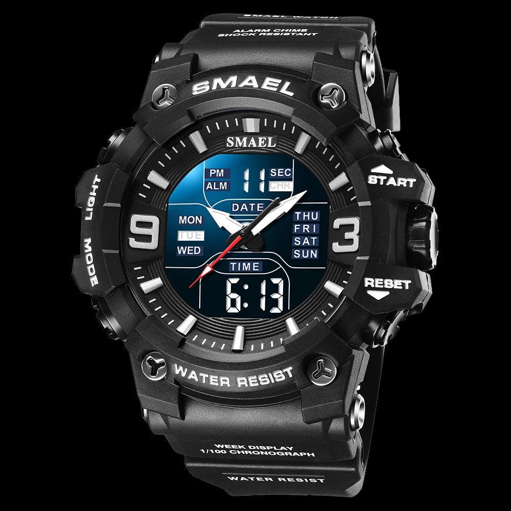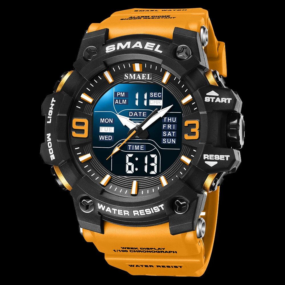 Este relógio Smael masculino é perfeito para atividades ao ar livre. Com design militar camuflagem e resistente à água, este relógio possui movimento de quartzo analógico e digital, com função de tempo duplo para maior praticidade. Ideal para um estilo casual e esportivo.